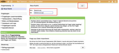 Nun sollte eine Eingabemaske erscheinen, in denen ihr ein Kürzel und eine Bezeichnung für eure Rubrik eintragt. Hier eignen sich einfache und sprechende Titel, um eure Rubriken später zuordnen zu können. Eine Möglichkeit hierbei ist es, eure Rubriken nach den einzelnen Themenbereichen eures Fragebogens zu ordnen. In unserem Fall wären eine sinnvolle Rubrik beispielsweise „MN“ - „Mediennutzung“. Nach der Benennung eurer Rubrik klickt ihr auf Speichern.