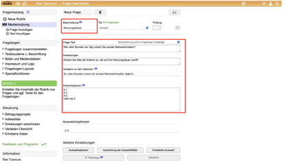 In unserem Beispiel haben wir uns für den Typen Auswahl entschieden. Um eure Frage später wiederzufinden, gebt ihr zuerst eine passende Beschreibung für eure Frage ein.