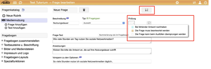 Über das Feld Prüfung könnt ihr zudem einstellen, ob es sich bei der Frage um eine Pflichtfrage handelt und beantwortet werden muss oder ob diese auch übersprungen werden kann. Anschließend klickt ihr auf Speichern.