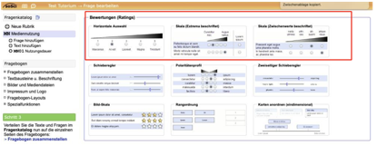 Um eine Skala zu erstellen, klickt ihr unter dem Punkt Bewertungen (Ratings) auf einen der Typen Horizontale Auswahl, Skala (Extrema beschriftet) oder Skala (Zwischenwerte beschriftet). In unserem Beispiel entscheiden wir uns für den Fragetyp „Skala (Zwischenwerte beschriftet)“.