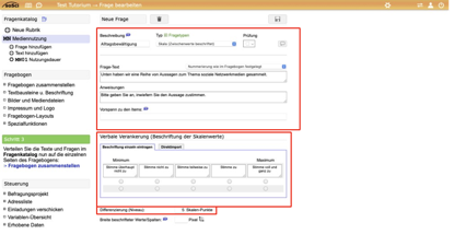 Wie auch bei den anderen Frage-Typen könnt ihr hier zunächst die Beschreibung, den Frage-Text, Anweisungen und einen Vorspann zu den Items eintragen. Unter dem Punkt Verbale Verankerungen habt ihr nun die Möglichkeit, die einzelnen Abstufungen eurer Skala einzutragen. In unserem Fall „Stimme überhaupt nicht zu“ bis „Stimme voll und ganz zu“. Zudem könnt ihr Auswählen, wie viele Differenzierungen eure Skala beinhalten soll. Die Voreinstellung liegt hier bereits bei fünf.