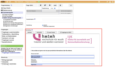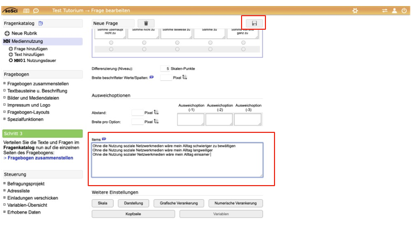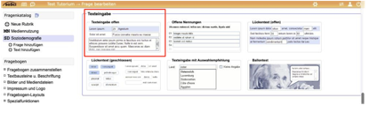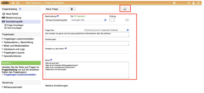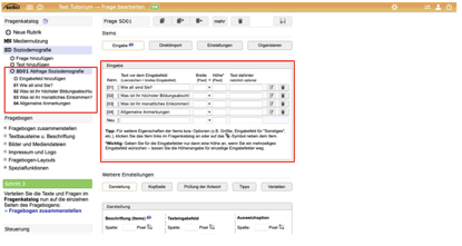 Anschließend erscheint eure Frage im linken Menü (Nicht wundern, wir haben die Frage diesmal ein einer neuen Rubrik „SD - „Soziodemografie“ erstellt, da diese thematisch passender ist). Nun habt ihr noch die Möglichkeit, beispielsweise die Größe der Eingabefelder anzupassen. Dies ist in der Regel jedoch nicht nötig. Ihr könnt diese Felder einfach freilassen.