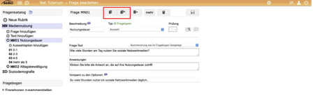 Wollt ihr eine Frage innerhalb eures Befragungsprojektes kopieren, weil ihr sie z.B. mehrfach oder in abgewandelter Form in eurem Fragebogen verwenden wollt, dann müsst ihr innerhalb der Fragebogen auf eines der beiden Kopier-Symbole über der Frage klicken. Nun könnt ihr die Frage entweder Kopieren (linkes Feld) oder direkt in eine neue Rubrik einfügen (rechtes Feld).