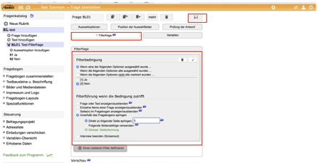 Diese springen dann direkt zur Schlussseite: Hierfür wählt ihr unter “Filterführung wenn die Bedingung zutrifft” innerhalb des Fragebogens springen aus. Anschließend wählt ihr die Seitennummer vor der letzten Seite aus (in unserem Fall Seite 5).
