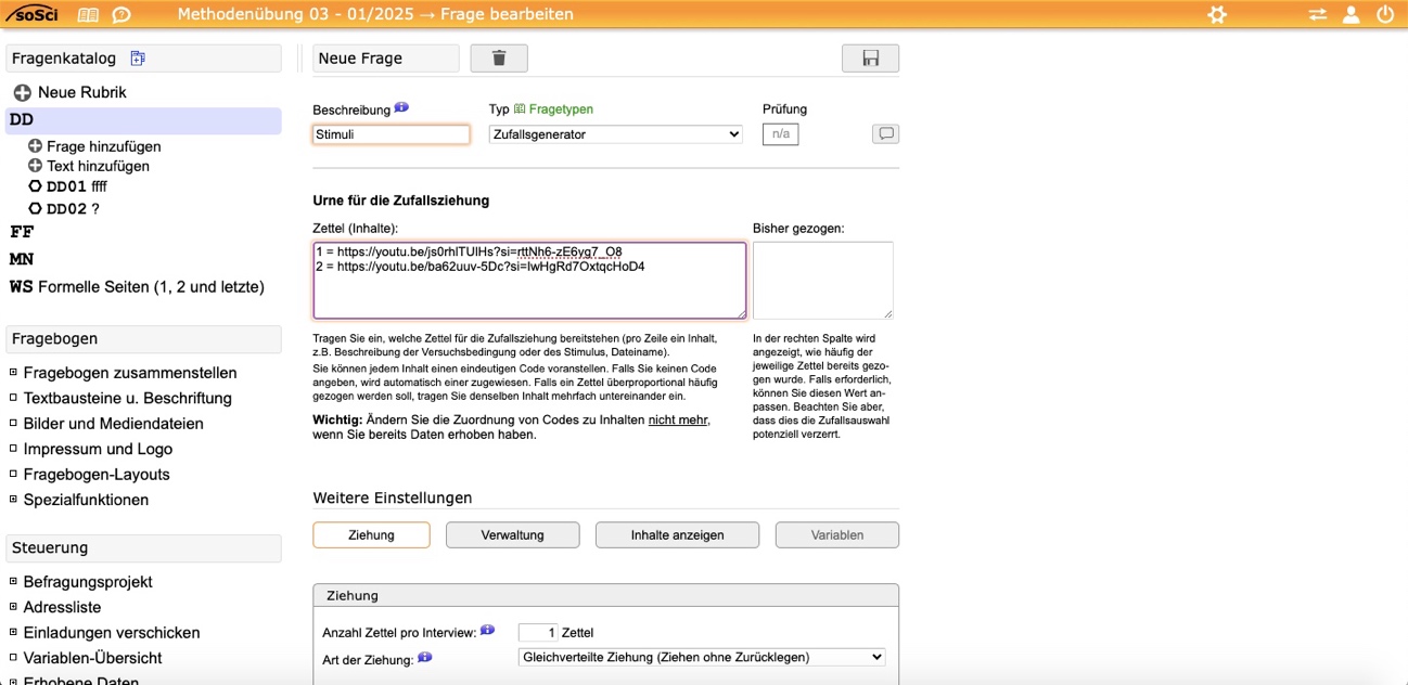 Hier seht ihr dann ein Feld, in das ihr eure “Zettel” schreiben könnt. Das sind die Dinge, die die Teilnehmer:innen eurer Befragung sehen sollen, bei denen die Randominisierung stattfindet. Wichtig zu beachten dabei ist, dass ihr die einzelnen Optionen durchnummeriert mit 1=..., 2=... usw. Dahinter könnt ihr dann z.B. Links zu Videos, die gezeigt werden sollen, einfügen. Am Ende könnt ihr noch festlegen wie viele Zettel pro Person gezogen werden sollen und was für eine Art der Ziehung stattfinden soll.