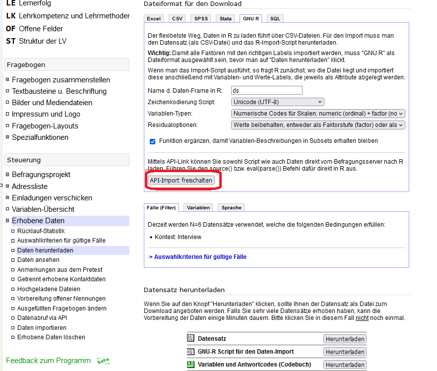 Da ihr den Datensatz in R verwenden möchtet, wählt ihr bei GNU R aus und klickt hier zunächst „API-Import freischalten“.