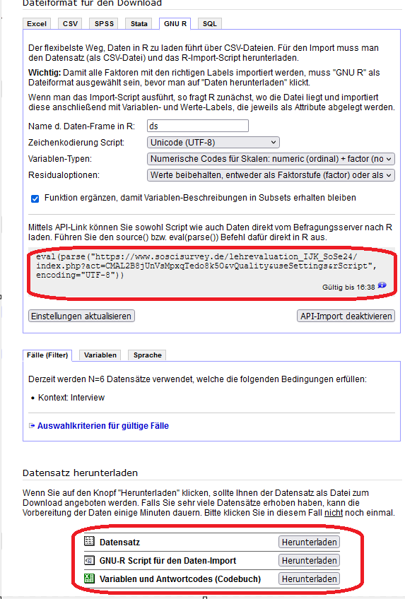 Daraufhin kreiert SoSciSurvey einen API-Link. Diesen müsst ihr dann kopieren und in eure R-Skript (oder Markdown-Datei) einfügen. So werden die Daten automatisch reingeladen. Zusätzlich könnt ihr bei den Felden unten den Datensatz, das GNU R Skript sowie das Codebuch noch herunterladen zum Abspeichern.